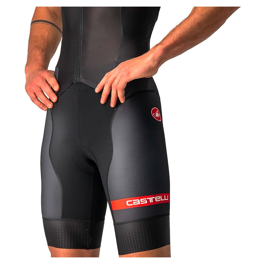 A abertura frontal Sanremo da Castelli facilita a curvatura para o ciclismo e o endireitamento para a corrida e natação, além de permitir pausas mais fáceis na natureza ou abertura para corridas extra quentes