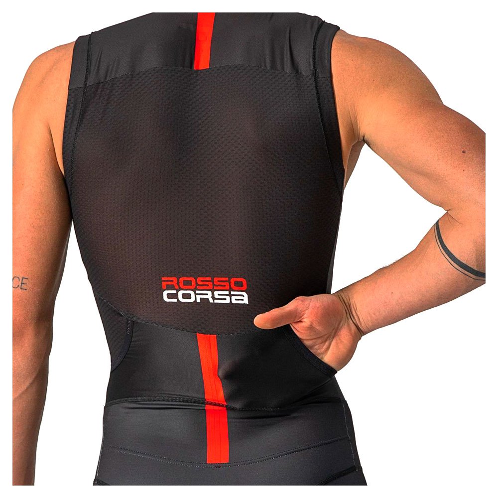 A versão sem mangas do traje Free Sanremo de Castelli, com detalhes meticulosamente pensados que fazem a diferença no dia da corrida.