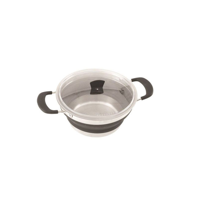 Pote dobrável da marca Outwell, feito de silicone e aço inoxidável.