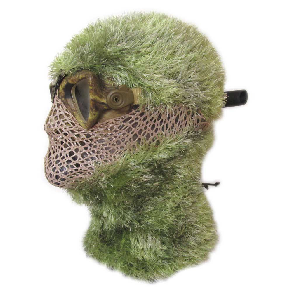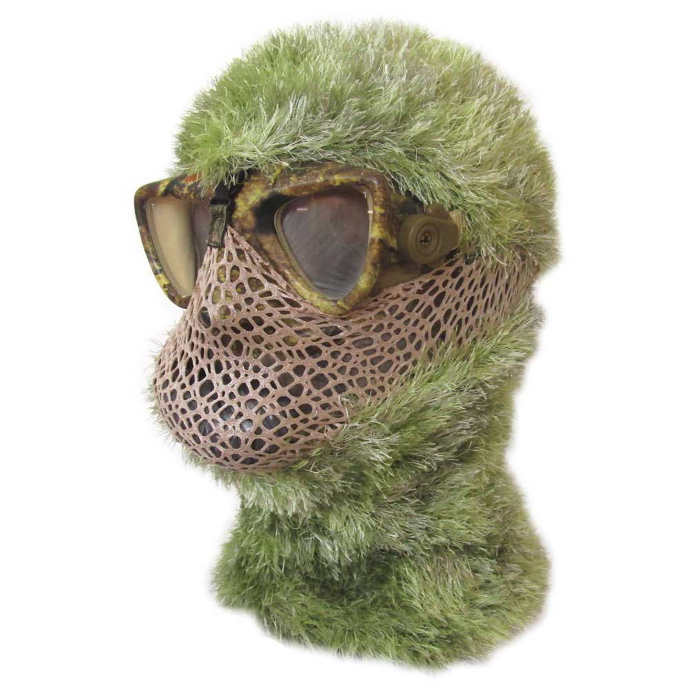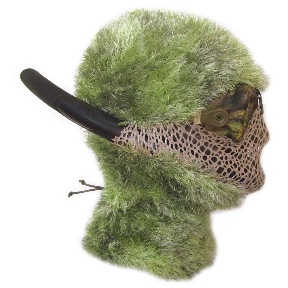Capuz de camuflagem constituído por uma estrutura de malha macia e elástica chamada Cryptik Skin, que reproduz o substrato de vegetação rasteira que cresce nas rochas.